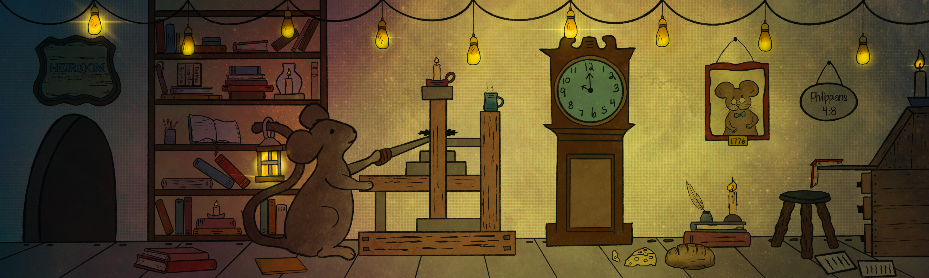 Mr. Heirloom Mouse proudly serves as our company mascot. He serves as the editor in chief and runs the printing press—no book is printed or published without his official stamp of approval.